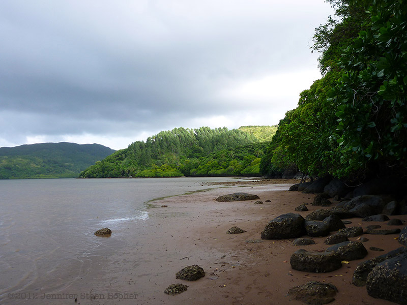 This morning I set off to explore the shore to the west of Matava. Off on the other side of that point is the village of Kadavu Koro, where many of the people who work at Matava live. Look closely at the shore in the photo above.