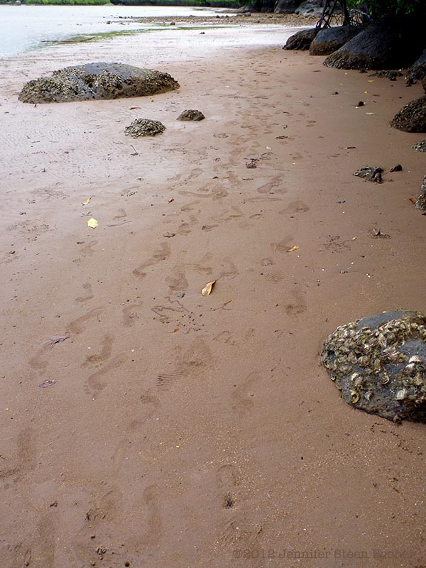 At low tide, this is the local highway. There’s a path through the forest, too, but this one must be easier to travel. Especially barefoot (there’s only one set of prints with shoes on.) Now look a little closer. Can you see all the holes, and maybe a few bright yellow dots?