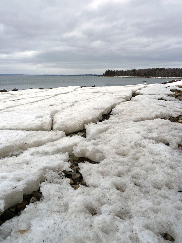 Turns out the cove is still under the usual thick cover of sea ice, and since the tide was coming in and the sky was a gloomy and ominous gray I didn’t linger. It is always hard to get a good photo of snow, and the huge expanse of ice pretty much defeated me.