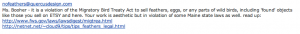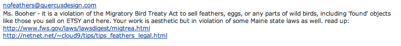 My latest adventure happened a few days ago when two game wardens knocked on my front door. I hadn’t been expecting them, but I was pretty sure I knew why they were there. See, back in December I got an anonymous email. I had just opened a second etsy store to empty out my studio of all the collections that have been piling up, and one of the things I listed were the feathers I’d picked up on the beach over the years. Here is what I read: