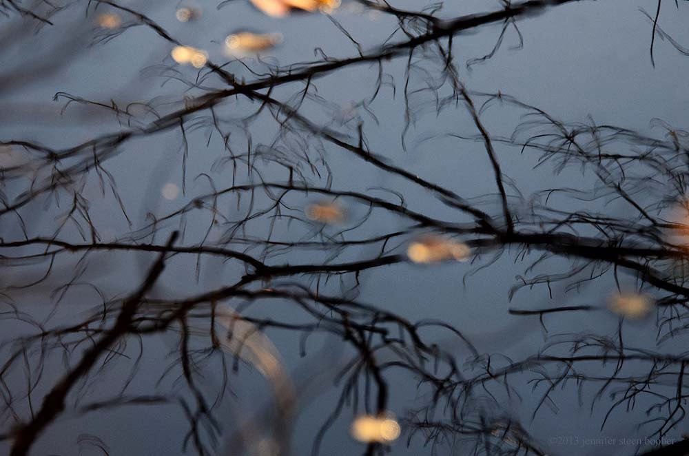 Fallen leaves floated on reflections of branches.