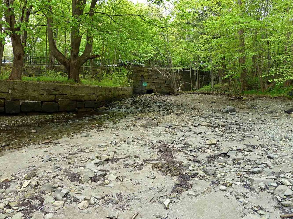 This is the outfall area at low tide. You can see the culvert opening at the base of the stone wall in the center of the photo. The wall is about 10 feet high, and holds up Eden Street. I may come back here on a blazing summer day – the deep shade might be pleasant then. In late May, with a cool mist hovering, it was chilly and not very picturesque.  The beachcombing, on the other hand, turned up some interesting bits: two large whelk shells, a surprisingly heavy branch of driftwood, an equally surprisingly light piece of charcoal, a bit of flow-blue porcelain, and a mysterious action figure.