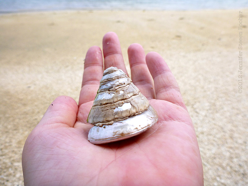 A small Trochus. I think these are called Top Shells. The outer covering had been eroded off, and the nacre looked like silvery pearl.