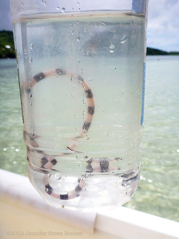 A plethora of kraits! When he came to pick us up in the skiff, George brought a baby water snake in a Fiji Water bottle. He let it go after I took the photo.