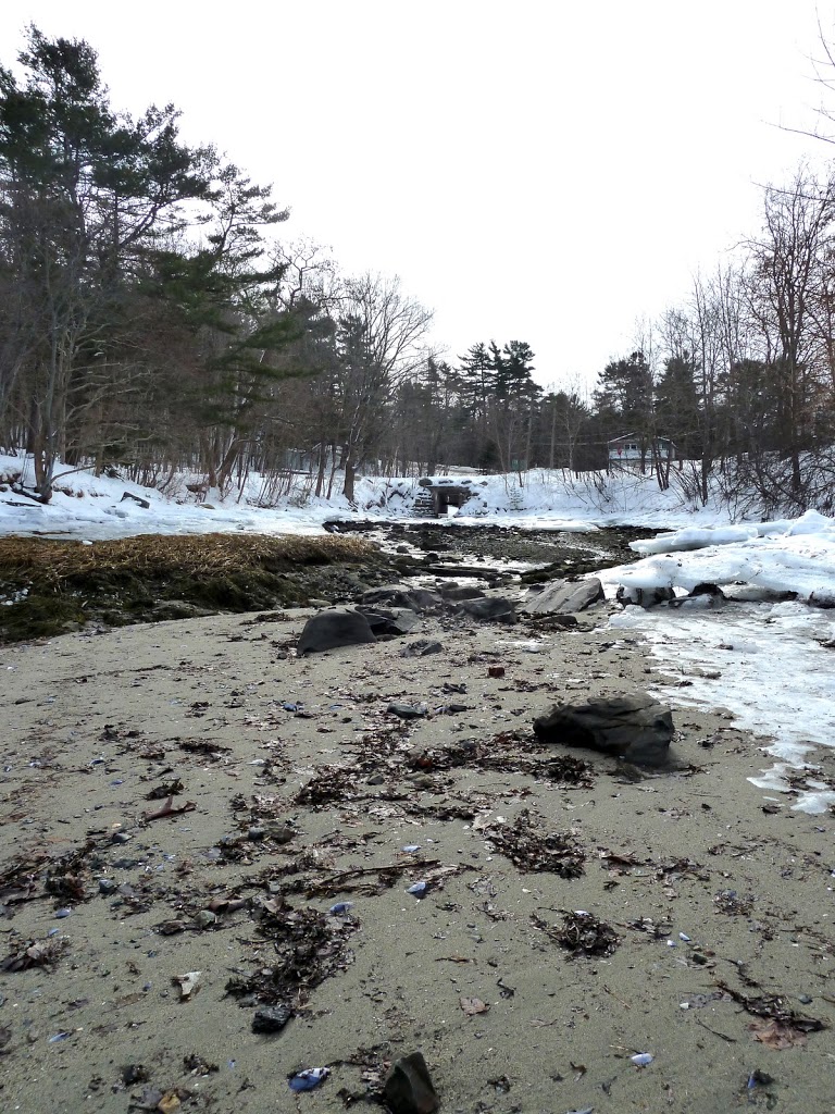 Beachcombing in the snow is an adventure. Climbing down the rocky bluff to the Hulls Cove beach, I misjudged the depth of snow over a stone and tumbled awkwardly down the hill. Not quite head-over-heels, more of a shoulder-over-shoulder roll. A year ago, even with the snow cushioning the rocks, it would have been excruciatingly painful. Today I scooted down to terra firma on my bottom, looked around sheepishly to see if anyone on the road had seen me, then laughed and dusted myself off. I bumped my knee a little, but the sheer joy of being able to take a little tumble in stride again more than made up for looking like an idiot.