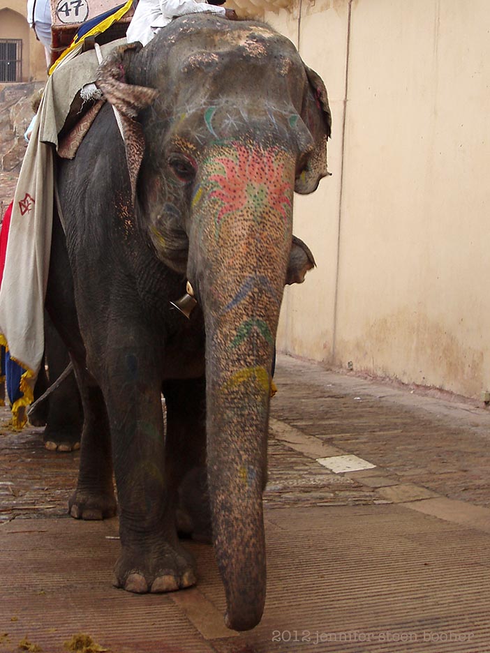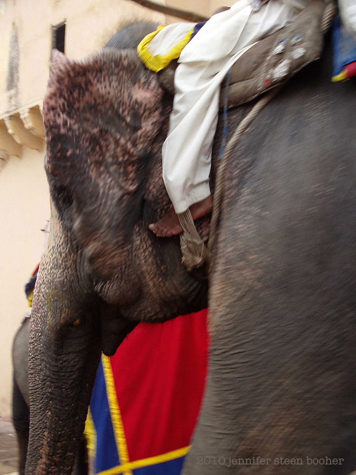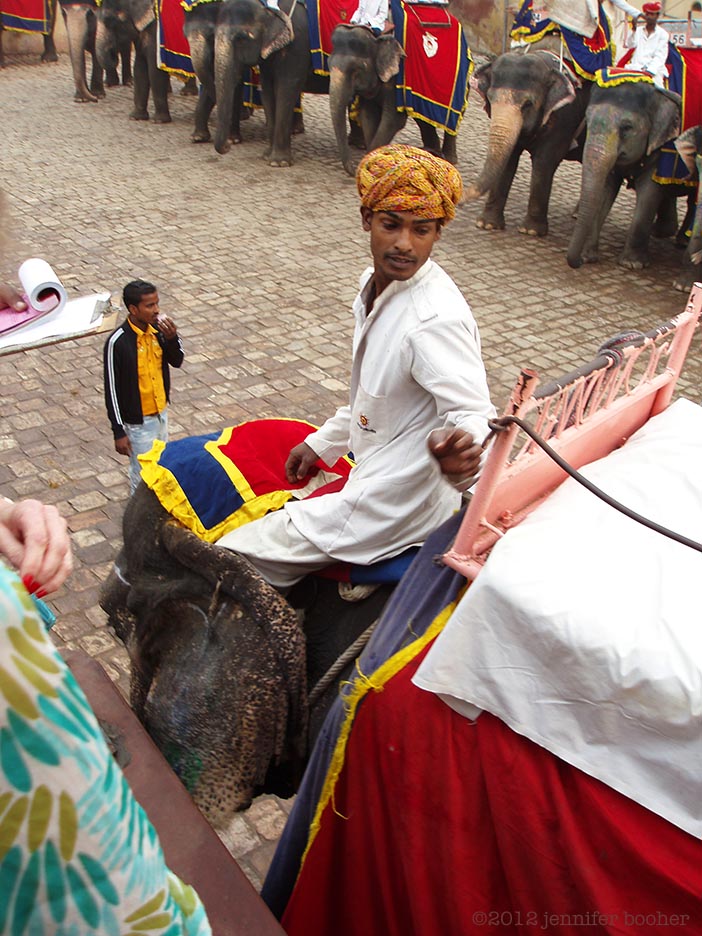 The mahouts are stretching and yawning, checking their harness and fluffing tassels. It’s overcast again. Let’s hope the rain holds off till we finish exploring! Picturesque, aren’t they? Pushy, too, in spite of the huge ‘no tipping’ signs posted everywhere.