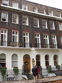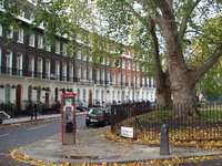 I’m staying in Bloomsbury, in a neighborhood that is probably quiet but is now reverberating with firecrackers because yesterday was Guy Fawkes Day (and it rained, so they must be catching up.) It is still overcast, so my photos are a little dreary. The temperature dropped, too, so I am grateful for my scarf and jacket. This is my hotel:
