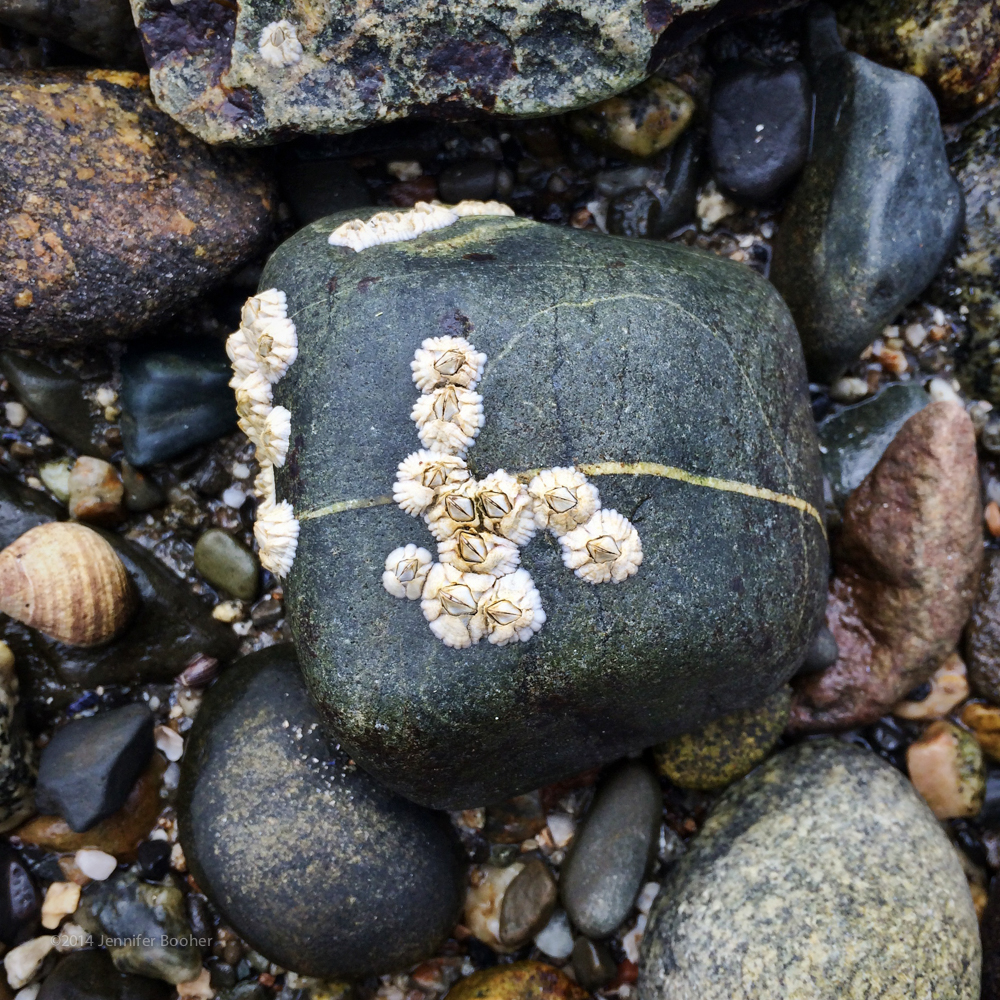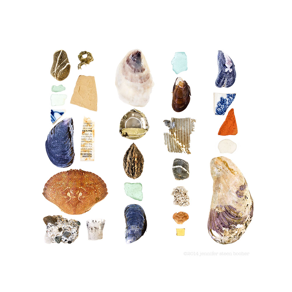 Beach stones, sea glass, Northern Rock Barnacle (Semibalanus balanoides), pottery shards, Blue Mussels (Mytilus edulis), plastic plant tag, Rock Crab (Cancer irroratus), manmade aggregate, plastic wadding (from a shotgun, maybe?), Atlantic Oyster (Crassostrea virginica), aluminum bottle top, unidentified seed, freshwater mussel?, duct tape, styrofoam, Green Crab (Carcinus maenas), plastic fragment, mutated Blue Mussel, sea brick, and Horse Mussel (Modiolus modiolus).