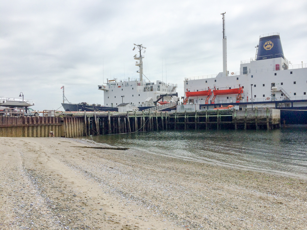 I did wander past the wall, but it felt uncomfortably like trespassing and I didn’t go far. I was mostly curious about the change in the beach composition. Just past that second wall the shoreline is rocky as far as I could see, and I was trying to figure out why this small portion is sand. It seemed highly unlikely that MMA would import sand onto the beach – it’s an industrial wharf, and this is docked just out of the photo to the left:
