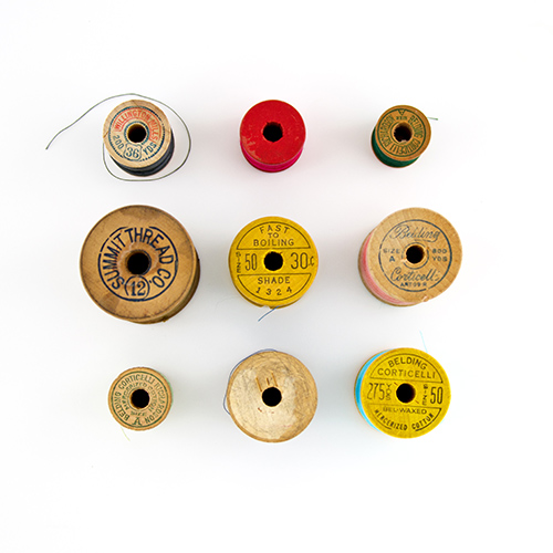 Getting slowly to the point, when my grandmothers died and we cleaned out their things, I took their workbaskets. I kept them intact on a shelf for a long time, as if something of them was preserved there. Last year I finally took everything out and mixed it in with my own things. Thread is thread, after all, and there’s no sense leaving it shut up in a box. Now Grandma Mary’s pincushion holds a mix of needles from three generations, and I sew on my son’s patches with thread that was spooled in the 1940s. I love the worn feel of the old wooden spools, and the wonderful typography on the old labels.
