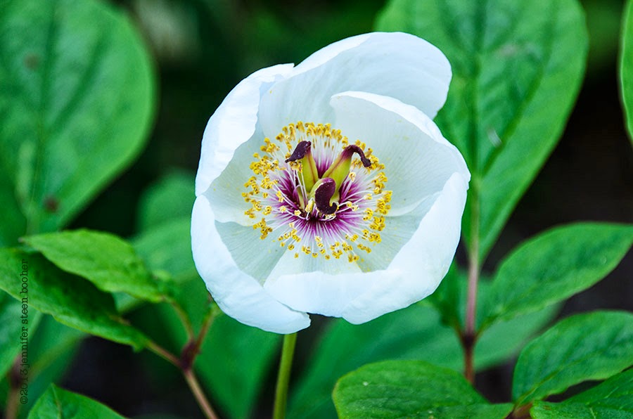 is Paeonia obovata var. willmottiae, a woodland peony. I find that purple center mesmerizing.