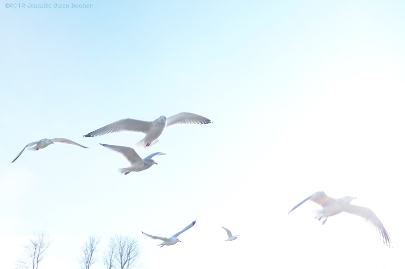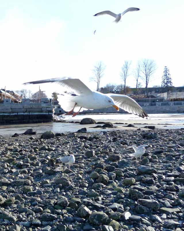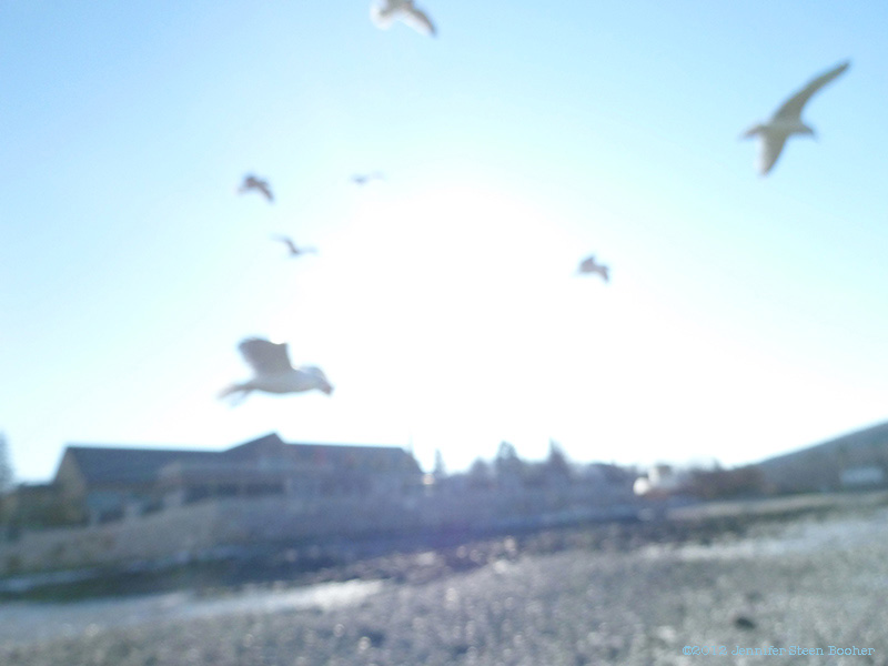 Then there were four standing huddled into the wind and watching me. Then eight gulls were moving down the beach with me, rising into the air if I got too close, and hovering on the wind just above my head.