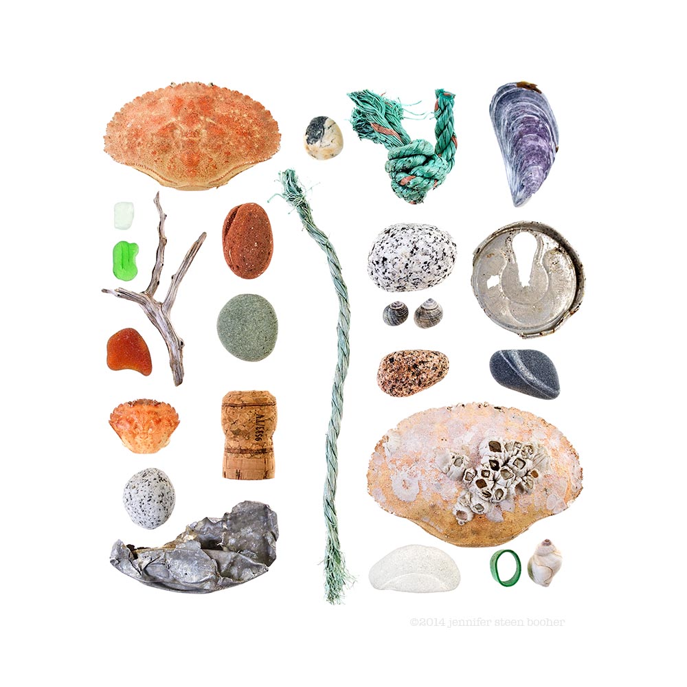 Rock Crab (Cancer irroratus), sea glass, driftwood, sea brick, beach stones, Green Crab (Carcinus maenas), champagne cork, crumpled aluminum can parts, polypropylene rope, Common Periwinkle (Littorina littorea), Blue Mussel (Mytilus edulis), lobster-claw band, Dog Whelk (Nucella lapillus)