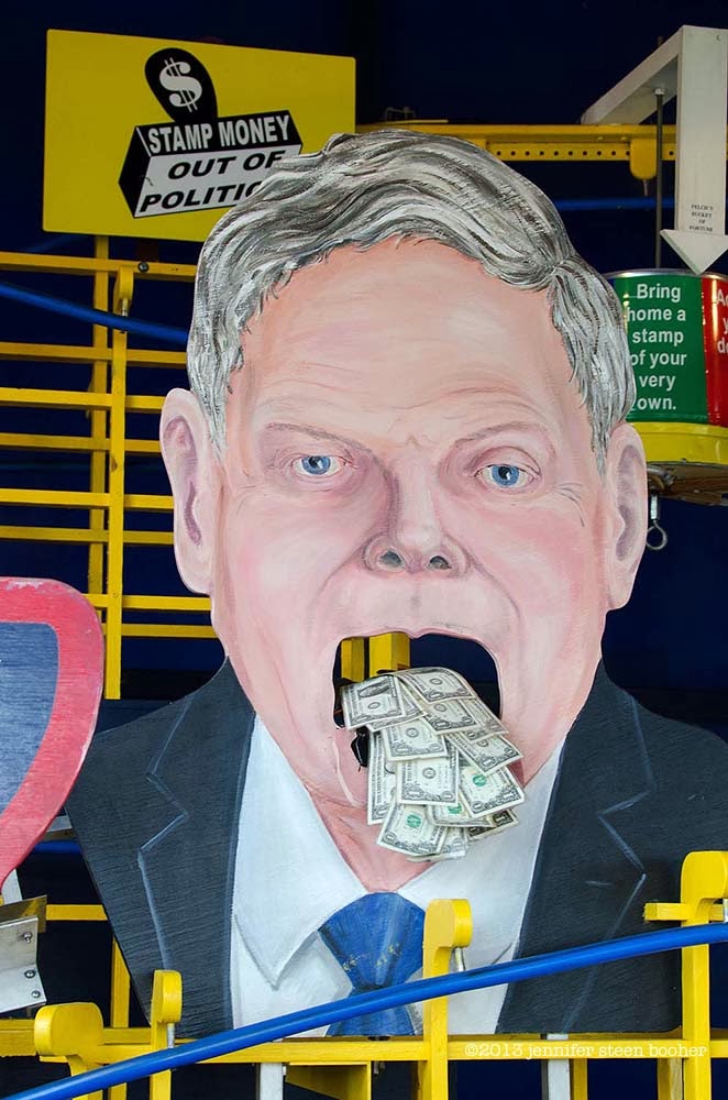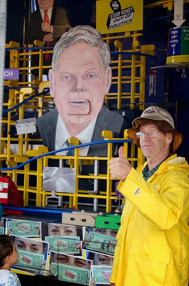 Called the “Ammend-O-Matic,” it was an elaborate machine that would carry a dollar bill through a series of slides, ramps, bells, swinging doors, and spinning signs into a politician’s mouth. There were signs all over like “Stamp money out of politics!” “A corporation is not a person!” and “Make your money talk!” They were selling ink stamps that you could use on your own money with those slogans. It was very entertaining to watch.