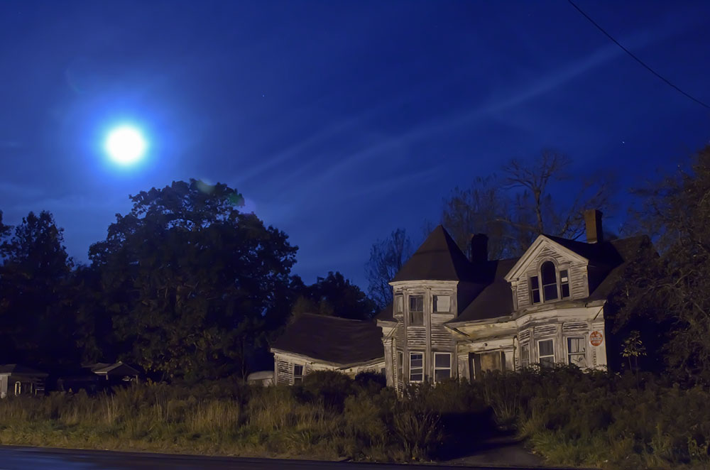 There’s an old house just north of Searsport, Maine, that I’ve been watching decay slowly for the last 20 years. When I first saw it, I dreamed of rescuing it, restoring the fanciful dormers, polishing the wood floors … no question now that it’s too late for rescue. Now it is a waiting game – how long before the ell’s roof caves in completely? When I drove past it last month after taking the show down in Portland it occurred to me that it is now a classic haunted house, and I began to wonder where the full moon would sit in the sky near it.